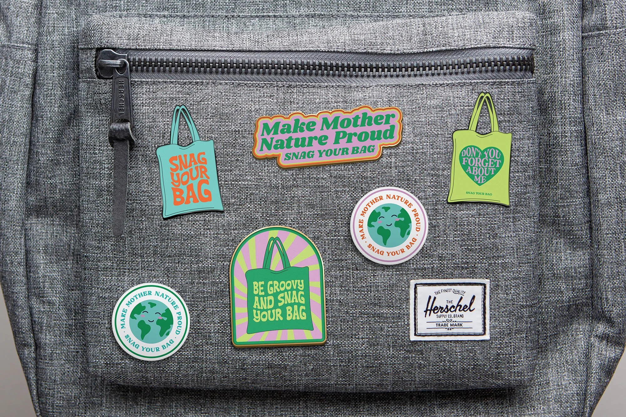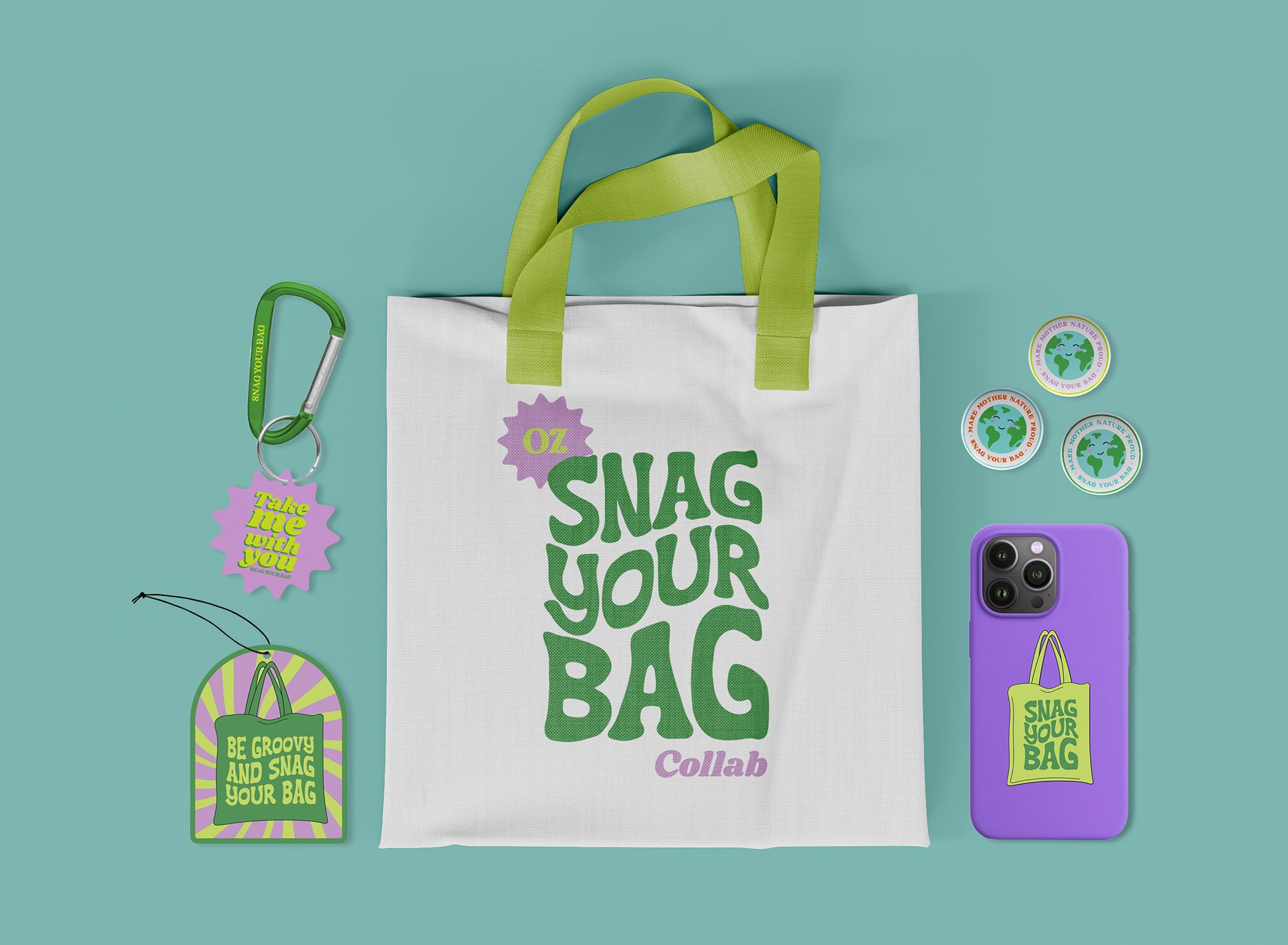 We all know the frustration of forgetting our bags at checkout. We designed the “Snag your Bag” brand to help people remember their reusable bags by creating a series of fun, retro-inspired merch with playful reminders. The color palette is bright and engaging, while the typography and overall design highlights a 70’s inspired style. The result is a brand design as groovy as saving the planet is.
